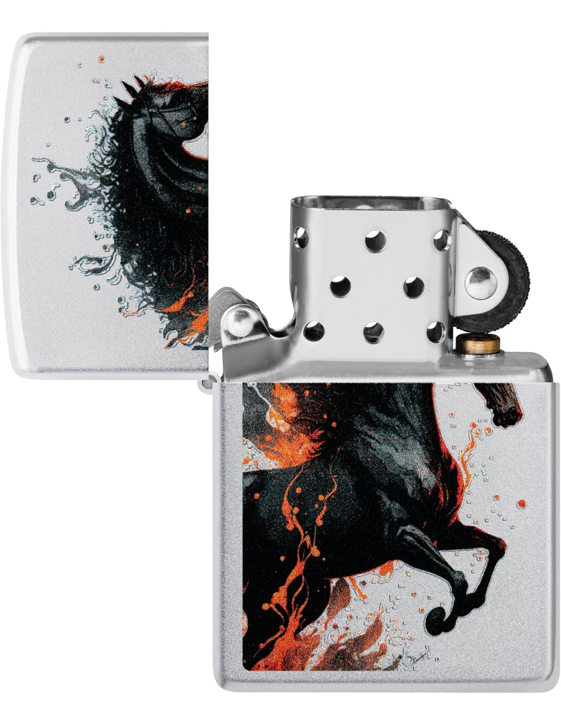 El Zippo 205 Fire Horse combina art, tradició i funcionalitat en un encenedor d’alta qualitat. El seu disseny Fire Horse sobre acabat Satin Chrome destaca per la seva estètica refinada i moderna, convertint-lo en un accessori atractiu tant per a col·leccionistes com per a usuaris diaris.