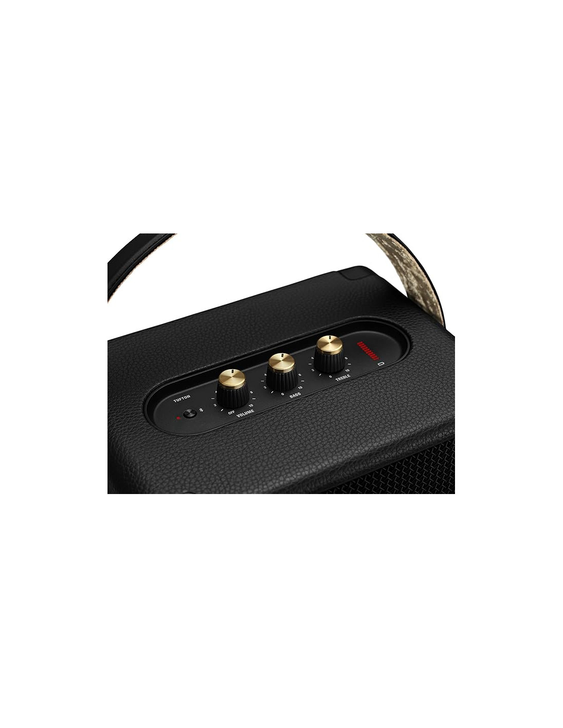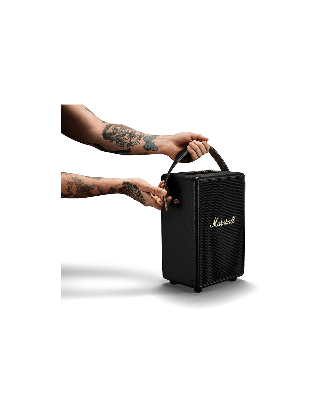 El diseño Black & Brass mantiene la estética vintage de Marshall, con acabado negro texturizado, detalles en latón y la clásica rejilla frontal con logotipo icónico. La correa inspirada en guitarras facilita su transporte y refuerza su estilo distintivo. Además, incorpora controles analógicos físicos para ajustar graves, agudos y volumen según tus preferencias.