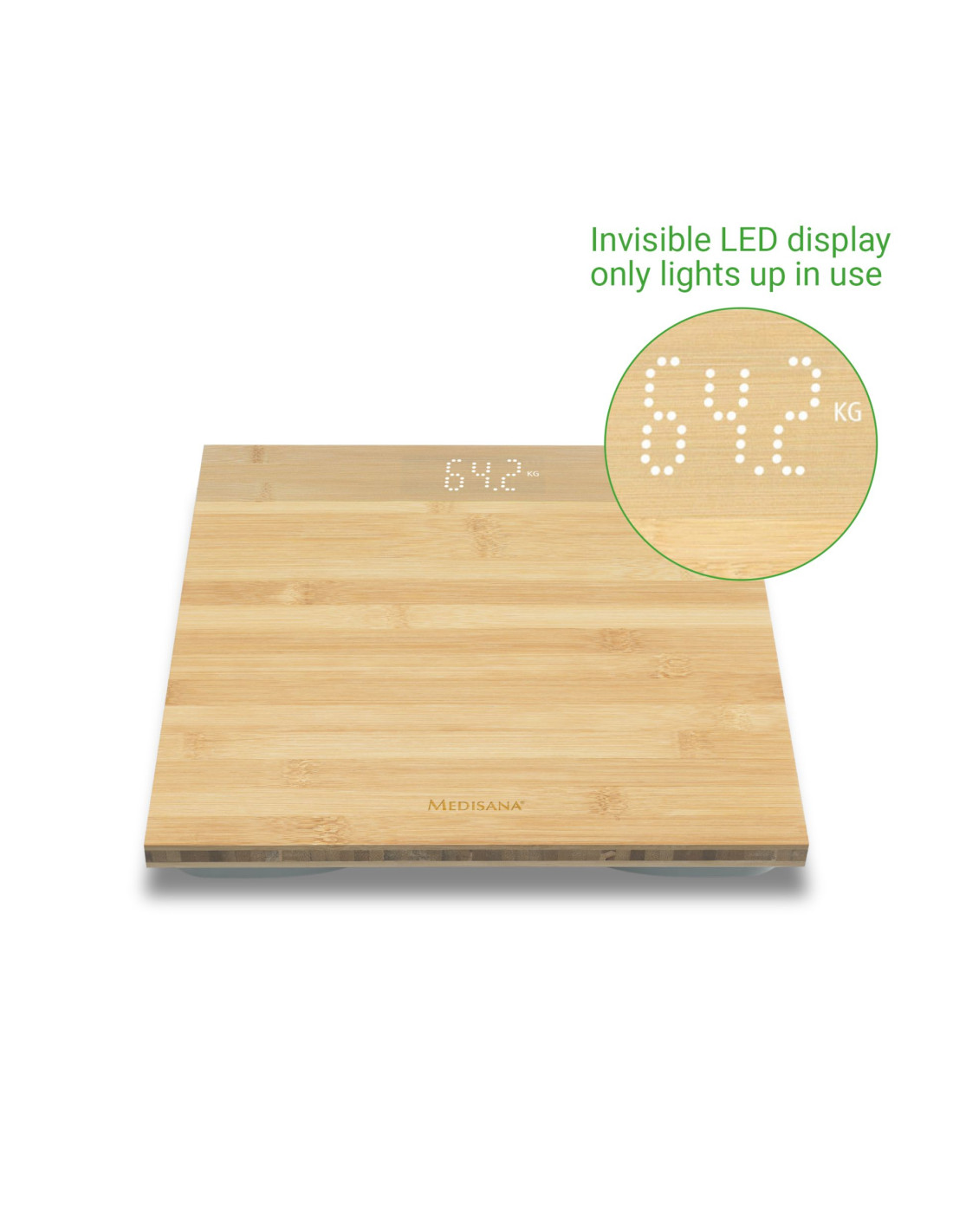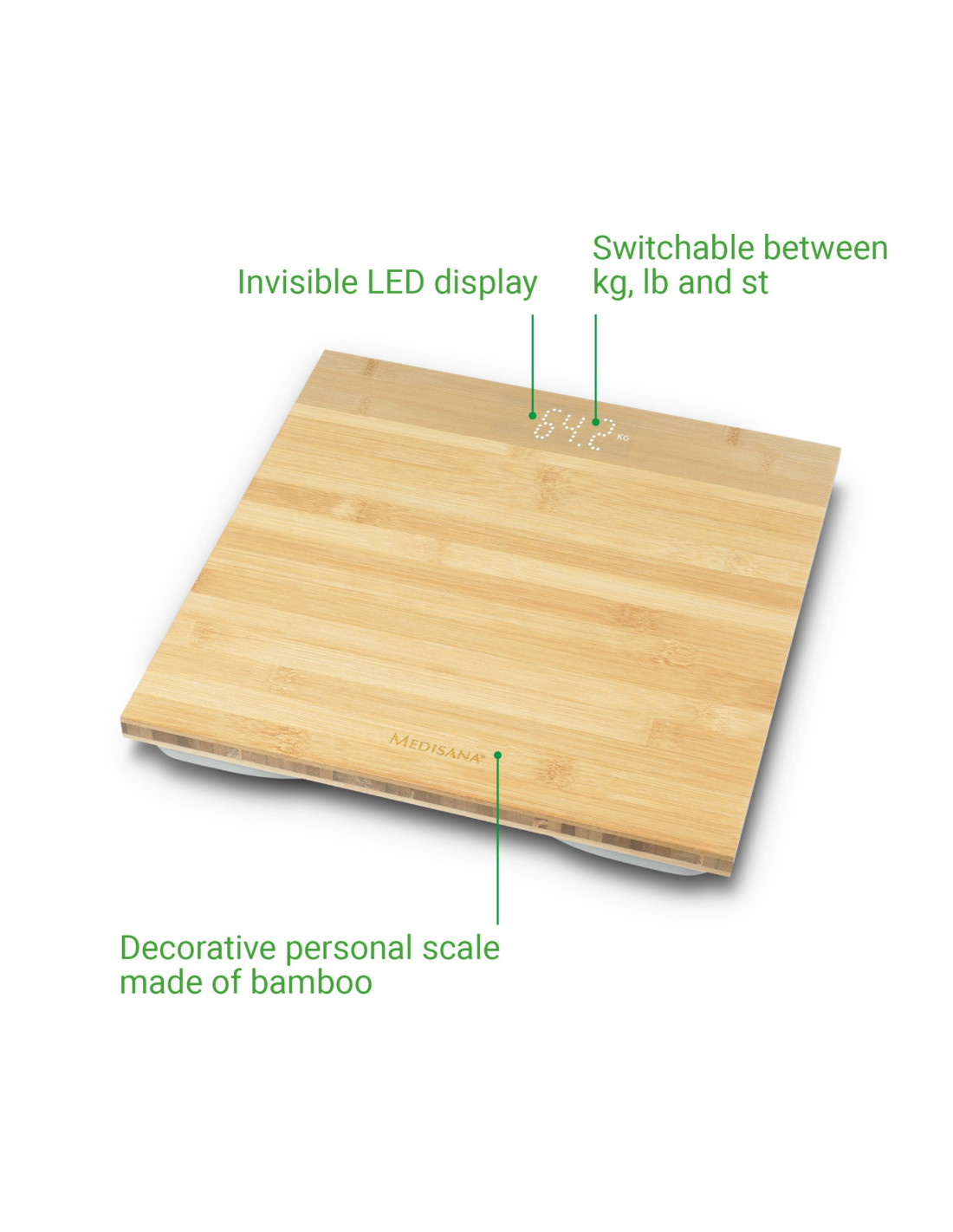 La Báscula Medisana PS 440 es una báscula digital con superficie de bambú que mide peso corporal hasta 180 kg.