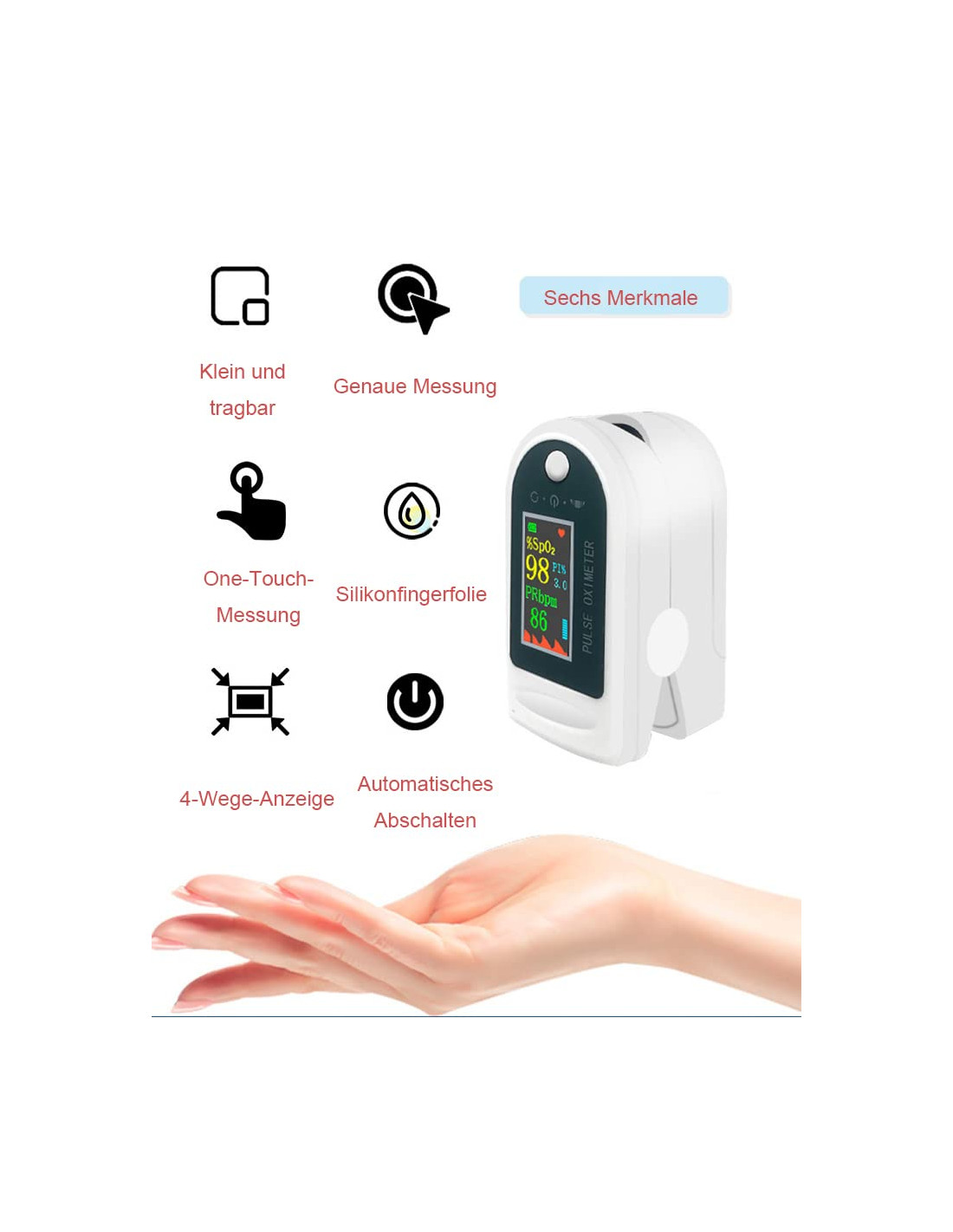 El Pulsómetro LK89 es un oxímetro de pulso digital portátil diseñado para medir nivel de oxígeno en sangre (SpO2) y frecuencia cardíaca de manera rápida y precisa. Su diseño compacto y ligero lo hace perfecto para usar en casa, durante actividades deportivas o en viajes.