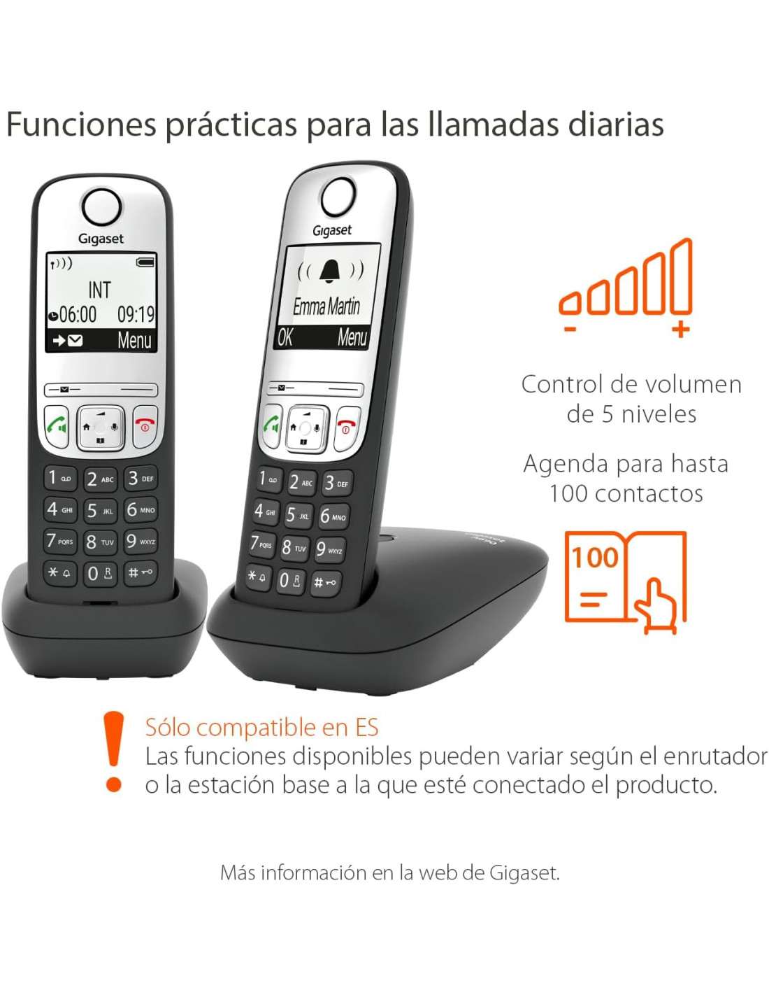 Este teléfono inalámbrico fiable incluye dos auriculares Gigaset A690H. Esto permite colocar un teléfono en diferentes habitaciones.