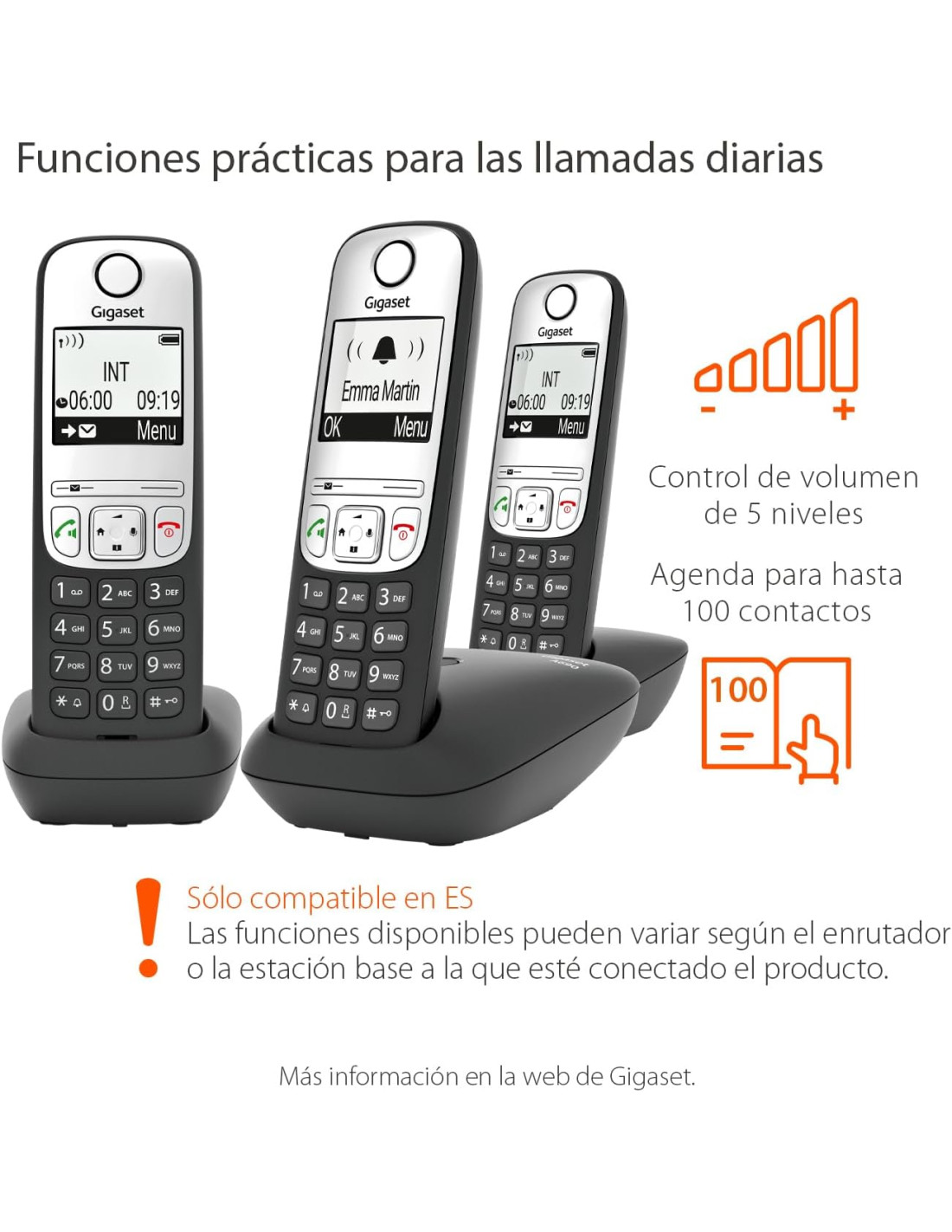 Este teléfono inalámbrico fiable incluye tres auriculares Gigaset A690H. Esto permite colocar teléfonos en diferentes habitaciones de la casa.